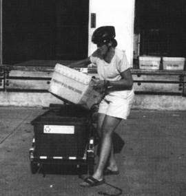 Unloading mail bins at Bikes at Work in Ames, IA.