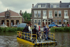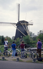 A group of touring cyclists admiring a windmill near Amsterdam.